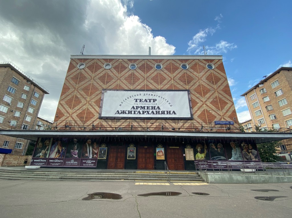 Типовой советский кинотеатр конца 1950-х на Ломоносовском проспекте, дом 17. Коробка, хоть и выполнена их самых обычных кирпичей двух цветов (посветлее и потемнее), повторяет узор фасада Дворца дожей в Венеции. Сейчас в здании Прогресса кино уже не показывают, здесь Московский драматический театр Джигарханяна.
