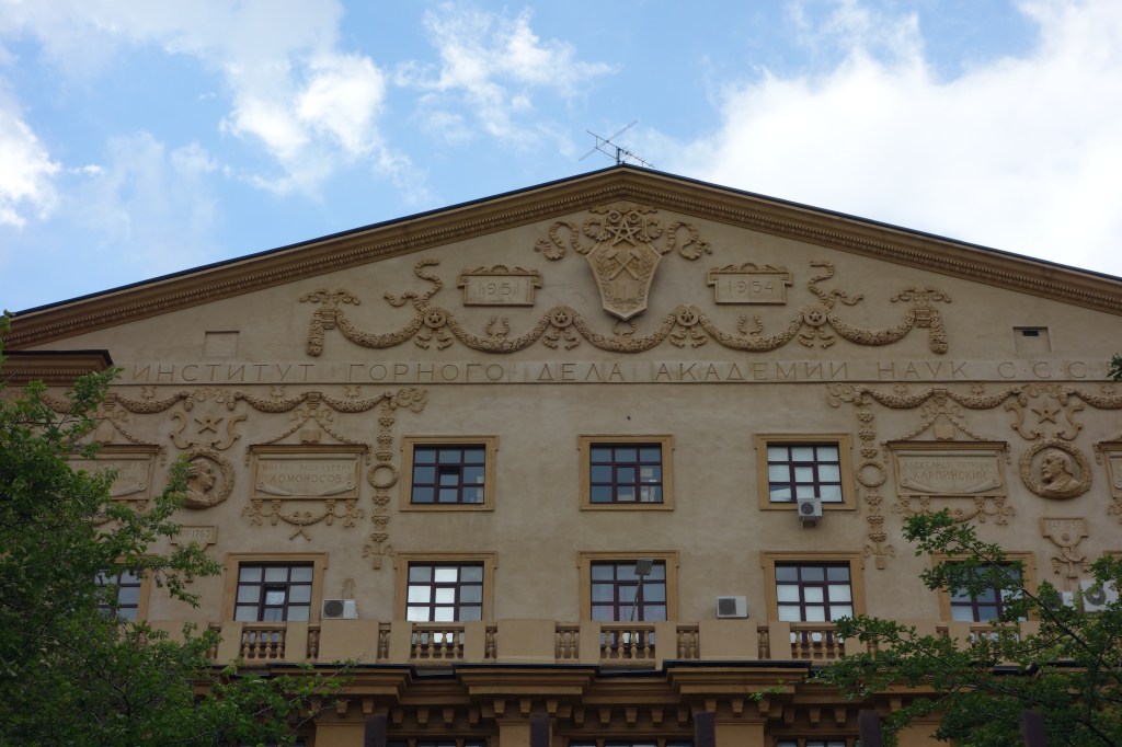 Монументальное здание советской эпохи с колоннадой, звёздами, лентами и другими украшениями из камня. Как полагается, за строгим забором, к которому даже как-то неловко подойти, чтобы сделать фотографию. Сейчас здесь Институт молекулярной биологии, от горного дела осталась только надпись на фасаде.