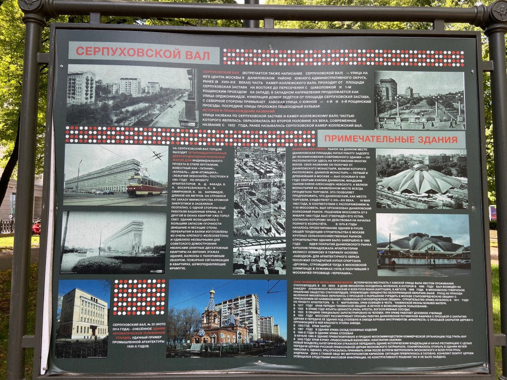 В 18-19 веках здесь проходила граница Москвы. Сейчас на этом месте тенистый сквер. Из основных достопримечательностей — Хавская церковь, Даниловский рынок и «Дом атомщика». Неподалёку рядом с метро Тульская вершится правосудие в Арбитражном суде города Москвы. С исторической точки зрения правильно всё-таки, видимо, Серпуховской вал, но принято написание через «и».